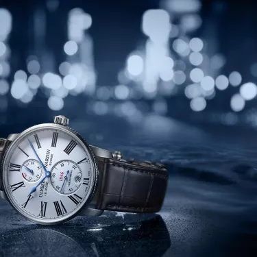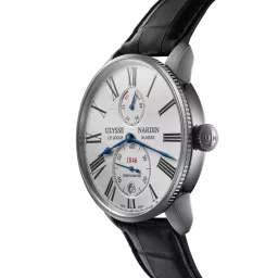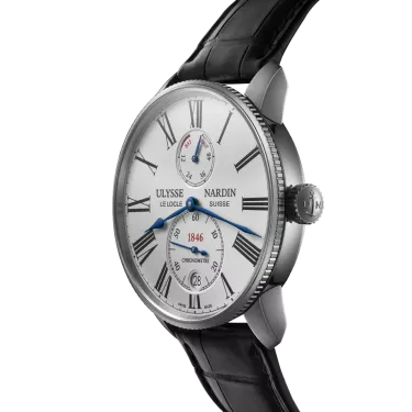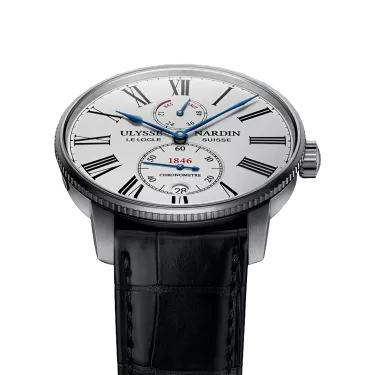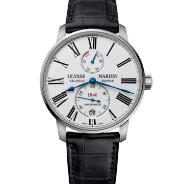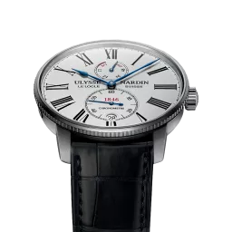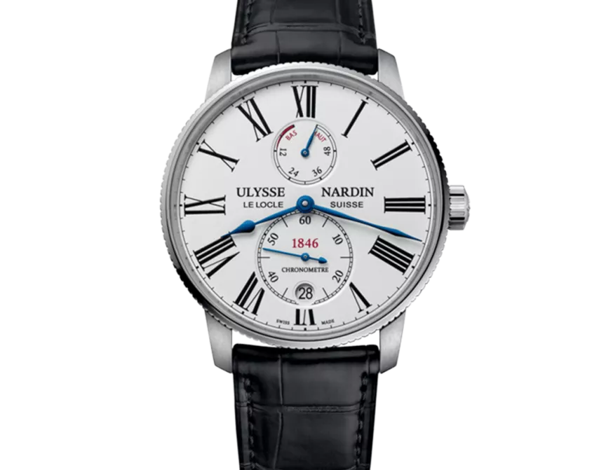 Marine Chronometer Torpilleur; Cal. UN-118 50 jewels. Self-winding movement, small seconds and power reserve indicator; Stainless steel case, 42mm, Water-resistant : 50 m; White lacquered dial, roman figures and Alligator strap.