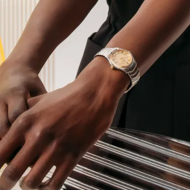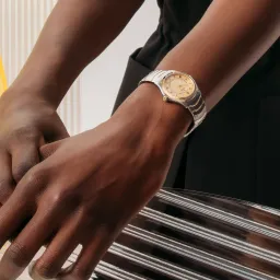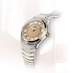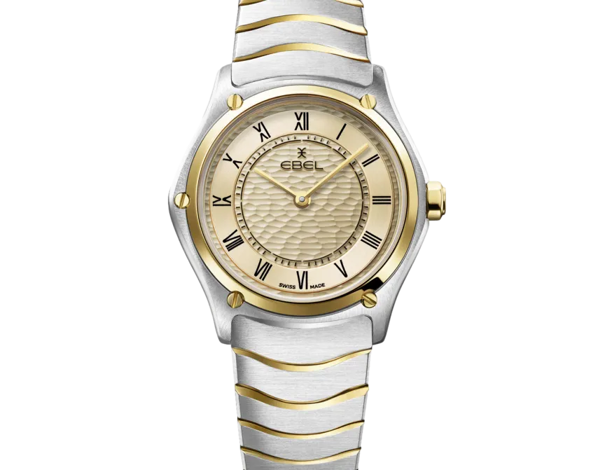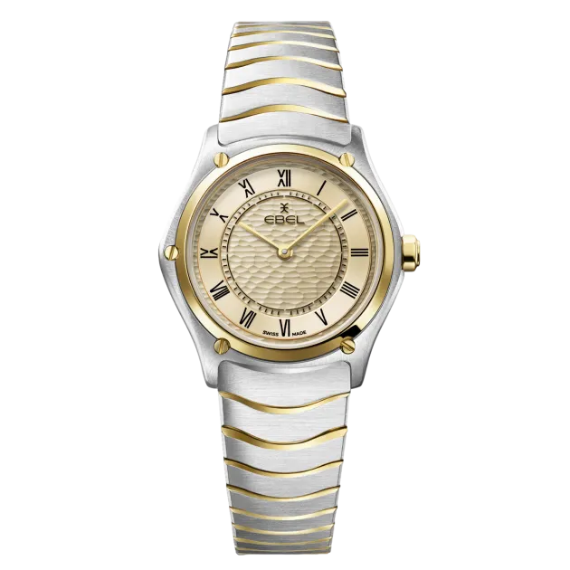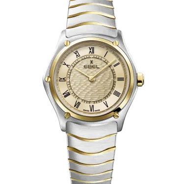 Montre EBEL Sport Classic pour femme, boîtier en acier inoxydable et or jaune 18 carats, Ø 29 mm, cadran beige clair avec chiffres romains gravés et peints en noir, motif ondulé, verre saphir avec traitement antireflet, bracelet à maillons ondulés bicolore en acier inoxydable avec boucle déployante, mouvement à quartz suisse, étanche jusqu'à 5 bars.