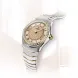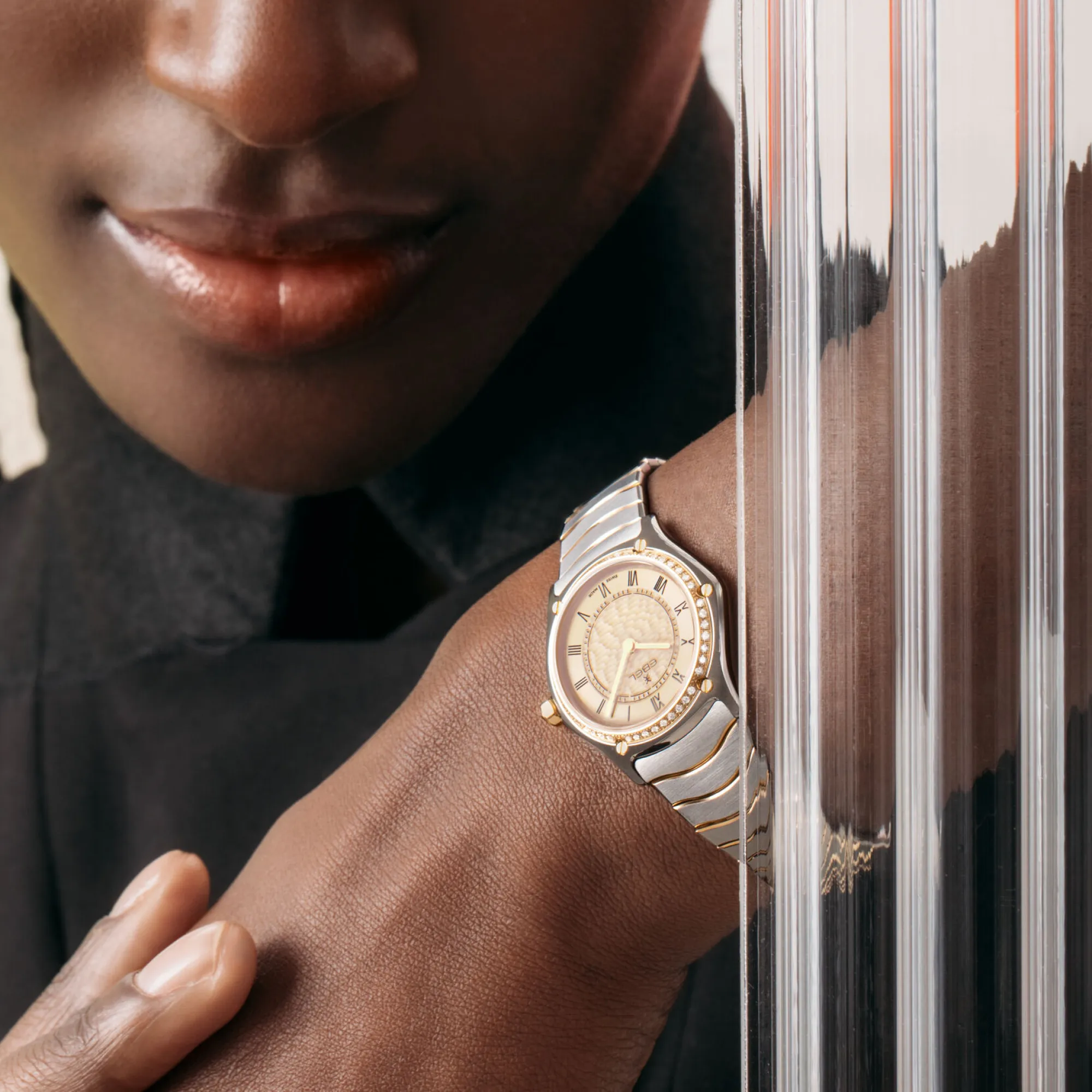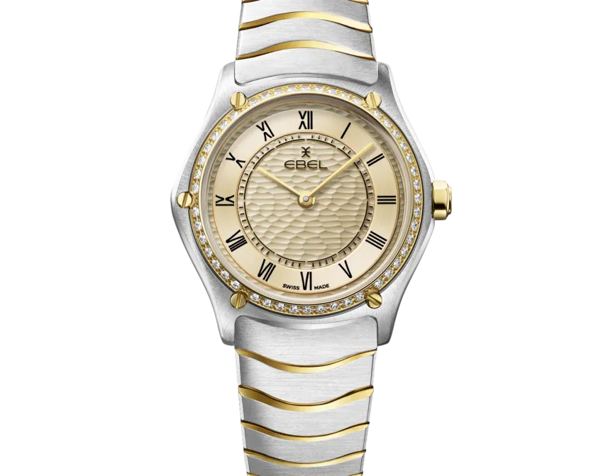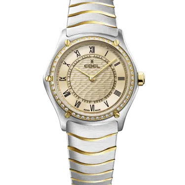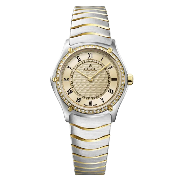 Montre EBEL Sport Classic pour femme, boîtier en acier inoxydable et or jaune 18 carats serti de 47 diamants (0,3055 ct), Ø 29 mm, cadran beige clair avec chiffres romains gravés et peints en noir, motif ondulé, verre saphir avec traitement antireflet, bracelet à maillons ondulés en acier inoxydable bicolore avec boucle déployante, mouvement à quartz suisse, étanche jusqu'à 5 bars.