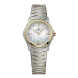 EBEL Sport Classic pour femme, boîtier en acier inoxydable et or jaune 18 carats, Ø 29,0 mm, cadran en nacre blanche avec chiffres romains appliqués et 8 diamants (0,052 ct), verre saphir avec traitement antireflet en dessous, bracelet bicolore en acier inoxydable à maillons ondulés avec au choix un fermoir ou une boucle déployante, mouvement suisse à quartz, étanche jusqu'à 50 mètres.