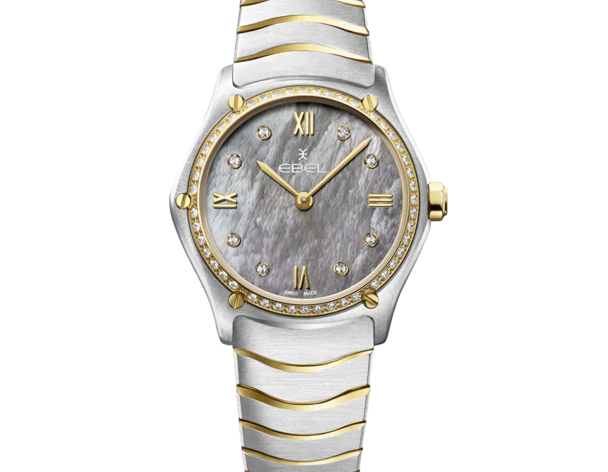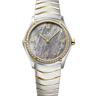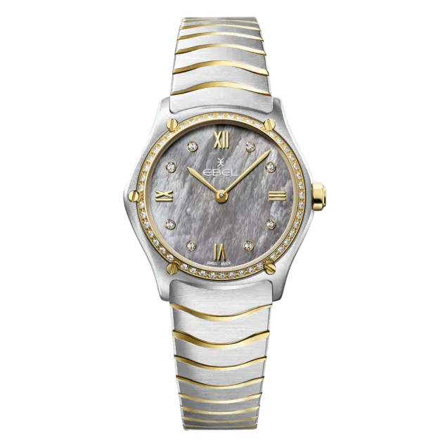 Montre EBEL Sport Classic pour femme, boîtier en acier inoxydable et or jaune 18 carats serti de 47 diamants (0,3055 ct), Ø 29 mm, cadran en nacre grise avec chiffres romains appliqués et 8 diamants (0,052 ct), verre saphir avec traitement antireflet, bracelet à maillons ondulés en acier inoxydable bicolore avec boucle déployante, mouvement à quartz suisse, étanche jusqu'à 5 bars.