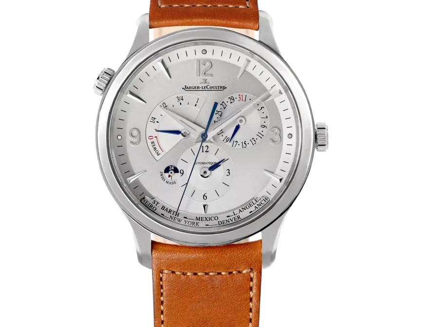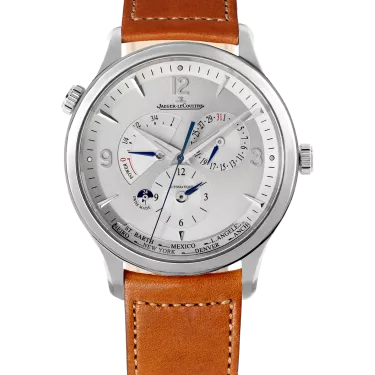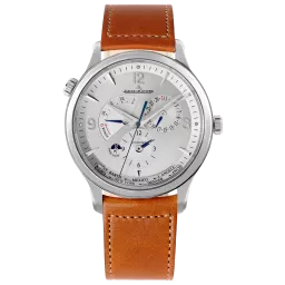 Jaeger-LeCoultre Master Control Geographic Silver Chronograph Dial Leather Strap Montre pour homme Modèle 4128420. Boîtier en acier inoxydable et bracelet en cuir brun. Fermoir Tang. Description du cadran : Aiguilles et index en chiffres arabes de couleur argentée, avec index des minutes sur le pourtour extérieur et 4 sous-cadrans sur un cadran argenté. Mouvement automatique. Calendrier : Date à 3 heures. Sous-cadrans du chronographe affichant : 24 heures, Dual Time, Réserve de marche. Animé par le moteur Calibre Jaeger LeCoultre 939AA avec réserve de marche de 70 heures. Fonctions de la montre : Date, 24 heures, réserve de marche, heure, minute, seconde, chronographe. Verre saphir résistant aux rayures. Boîtier de forme ronde. Taille du boîtier : 40 mm. Épaisseur du boîtier : 10,96 mm. Fond de boîtier transparent. Étanche à 50 mètres - 165 pieds.