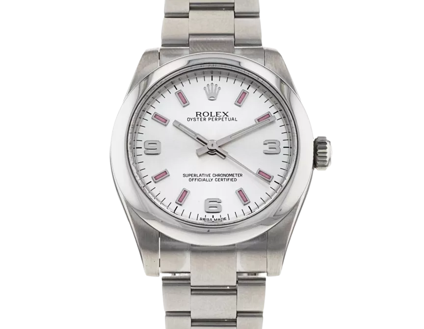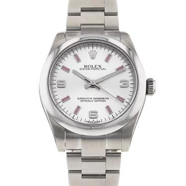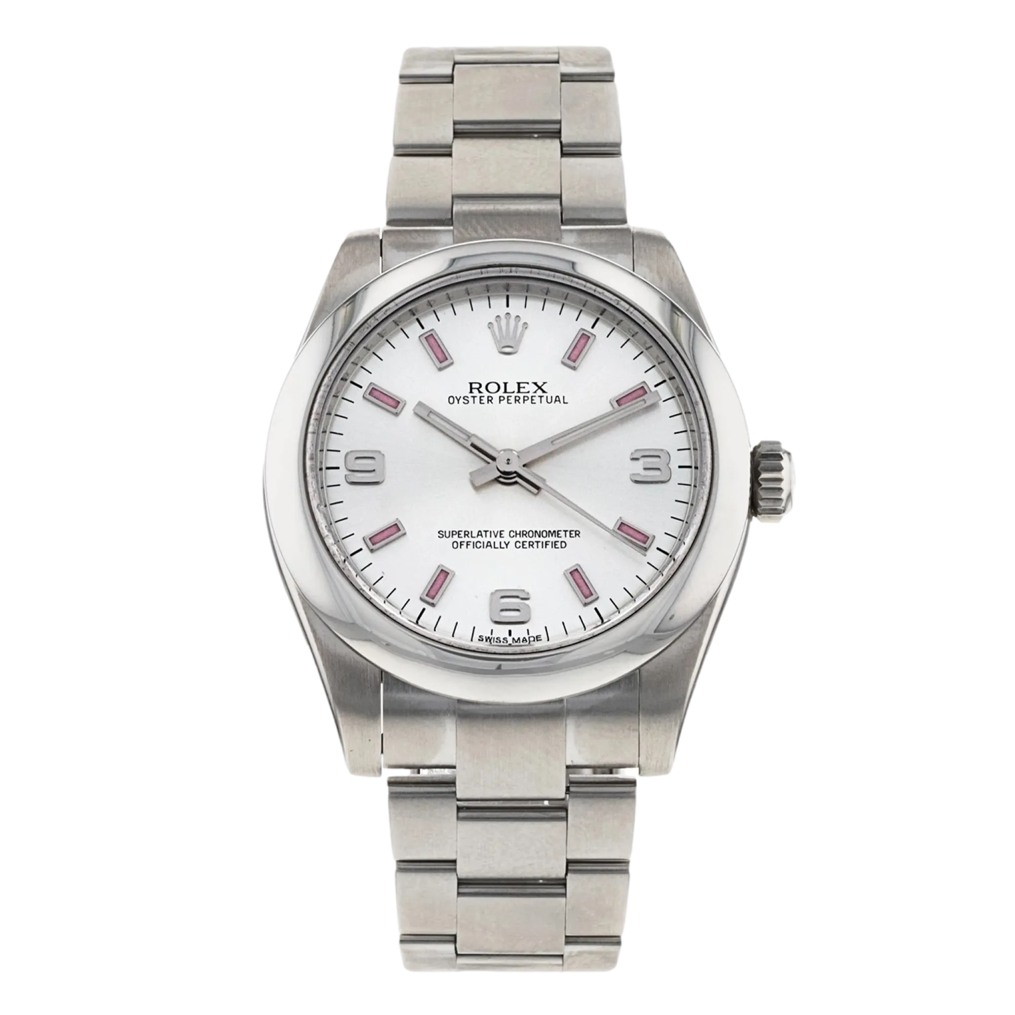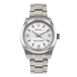 Rolex Lady Oyster Perpetual 177200 Mouvement : Automatique Taille du boîtier : 31 mm Matériau du boîtier : Acier Matériau du bracelet : Acier (Oyster) Type de cadran : Argenté avec chiffres arabes Étanchéité : 100 mètres