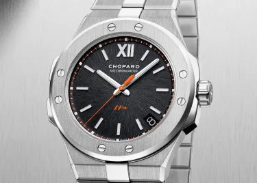 The black Pitch Black dial with subtle orange accents that covers one of the most advanced movements in the manufacturer's workshops, the Chopard 01.12-C caliber beating at a frequency of 8 Hz, twice as fast as a standard automatic movement. The codes of the Alpine Eagle collection are still present but with a much sportier look. A masterpiece of watchmaking prowess, we tell you!