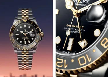And we can tell you that wearing an Oyster Perpetual GMT-Master II is like never wanting to take it off. What makes these new features particularly exciting? The return of the solid gold Jubilee bracelet, of course! Wearing it on your wrist has a significant impact (and weight). With indexes and hands made of this precious metal, placed on a black lacquered dial, and the precision of the finishing: the play of light on the material is striking. On the mechanical side, the latest versions of the GMT-Master II are powered by the caliber 3285, which displays not only the time (not bad for a watch) but also the date and a second time zone in 24-hour format. Whether it's the two-tone or all-gold model, one thing is certain: Rolex knows how to pull on the heartstrings.