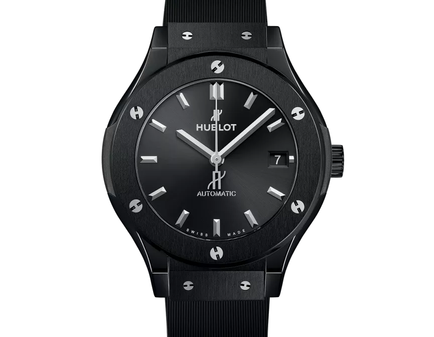 Hublot Classic Fusion Black Magic Polished and Satin-finished Black Ceramic case; Vertical Satin-finished Black Ceramic bezel with 6 H-shaped Titanium Screws; Sapphire with Anti-reflective Treatment; Matte Black lacquered Dial, Satin-finished Rhodium-plated Appliques and Polished Rhodium-plated Hands; Black Lined Rubber Straps; Black PVD Stainless Steel Deployant Buckle Clasp; HUB1112 and Self-winding Movement; 42 Hours power reserve and 50m or 5 ATM water resistance.