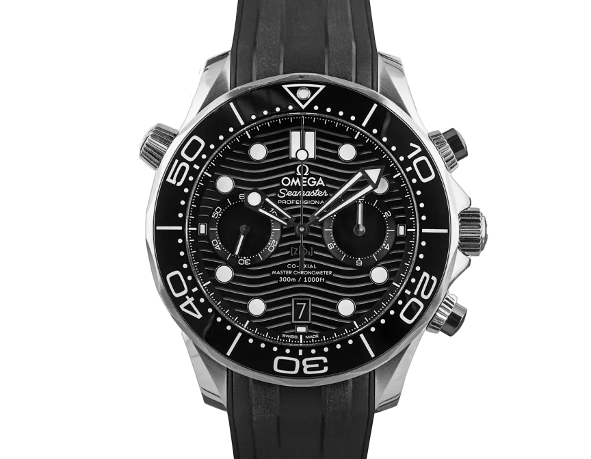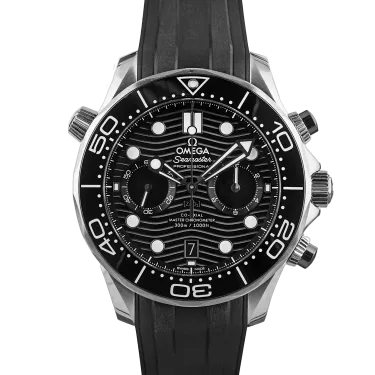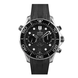 Since 1993, the Seamaster Professional Diver 300M has enjoyed a legendary following. Today’s modern collection has embraced that famous ocean heritage and updated it with OMEGA’s best innovation and design. This 44 mm chronograph model is crafted from stainless steel and includes a polished black ceramic bezel with a white enamel diving scale. The pushers are also polished black ceramic, as well as the dial which features laser-engraved waves and a date window at 6 o’clock. The subdial hands are rhodium-plated, along with all other hands and indexes which are filled with white Super-LumiNova. The watch is presented on a black rubber strap and is driven by the OMEGA Master Chronometer Calibre 9900, which can be seen through the sapphire-crystal on the wave-edged caseback.