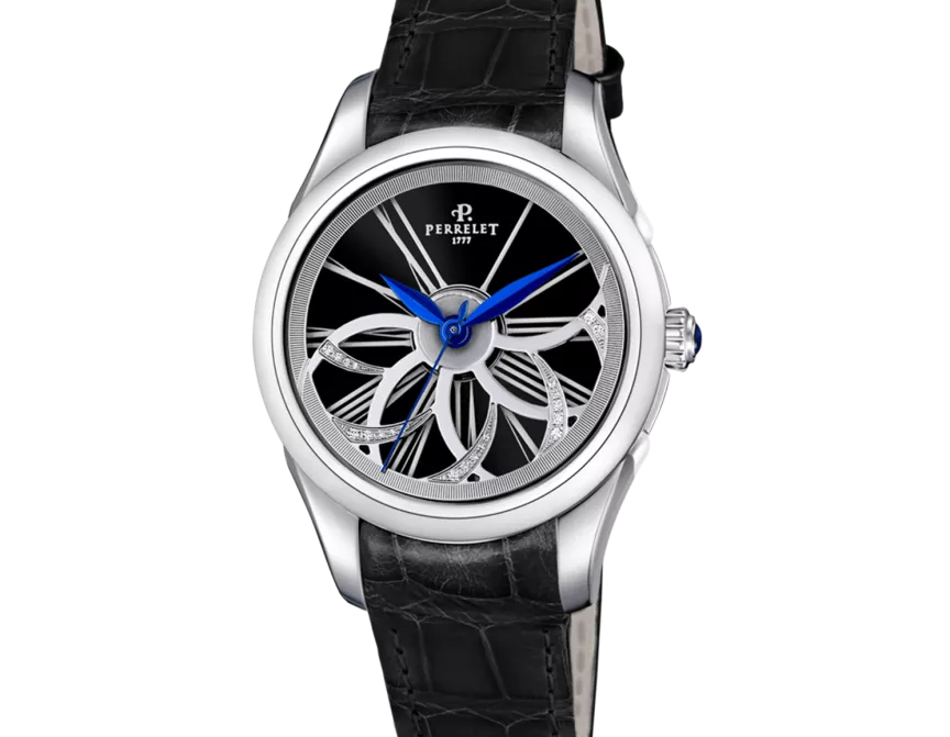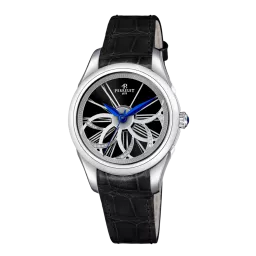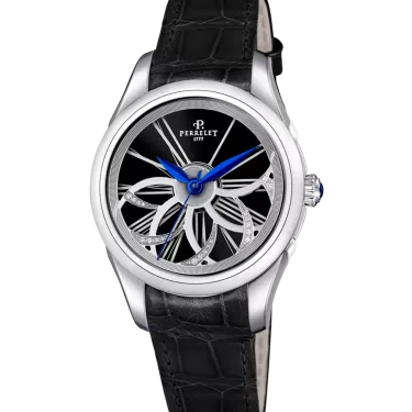 Perrelet enriches its ladies’ Diamond Flower line with a new model named Diamond Flower Amytis : collection designed “by women for women” and which combines a unique technique with brilliant expertise. This name evoking ancient history is inspired by the story of the hanging gardens of Babylon. The precious timepieces are equipped with the Double Rotor P-181-H caliber, patented by Perrelet and entirely produced within its Manufacture. In this collection, the rotor on the dial side depicts flower petals swaying in step with wrist movements. Each woman becomes actively involved in the poetic dynamics of her watch through her physical gestures. The mother-of-pearl, diamond, black, white or anthracite dials offer a delightful array of colors and contrasts that will elegantly accompany every woman in her daily life. Roman numerals converging towards the center add a final touch of character and originality to this collection. Functions central hands indicating hours, minutes and seconds; 5 ATM; Black glossy dial - petal-shaped diamonds double rotor, 19 diamonds (0,04ct), Top Wesselton VS1 dial and Deployment buckle. In-house automatic movement Calibre P-181-H, 42hours power reserve.