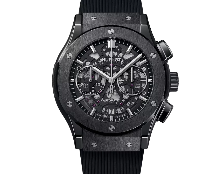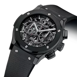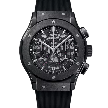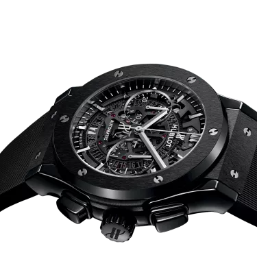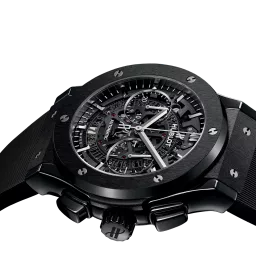 This Men's Watch has Fixed Black ceramic bezel with Black Skeleton dial and Silver-tone hands. The bezel secured with 6 polished "H" style titanium screws. The watch performs following functions: chronograph, date, hours, minutes and seconds. Date disc with white background is located at 6 o'clock position. Small-seconds sub-dial is located at 3 o'clock position. The watch has Black Rubber Strap with Push Button Folding Clasp. Sapphire crystal protects both sides of this watch. Automatic movement with a 42-hour power reserve. This model is water-resistant up to 50 meters / 150 ft. The watch comes with 45 mm Black Ceramic case. 525.CM.0170.RX Hublot Black Ceramic Watch.